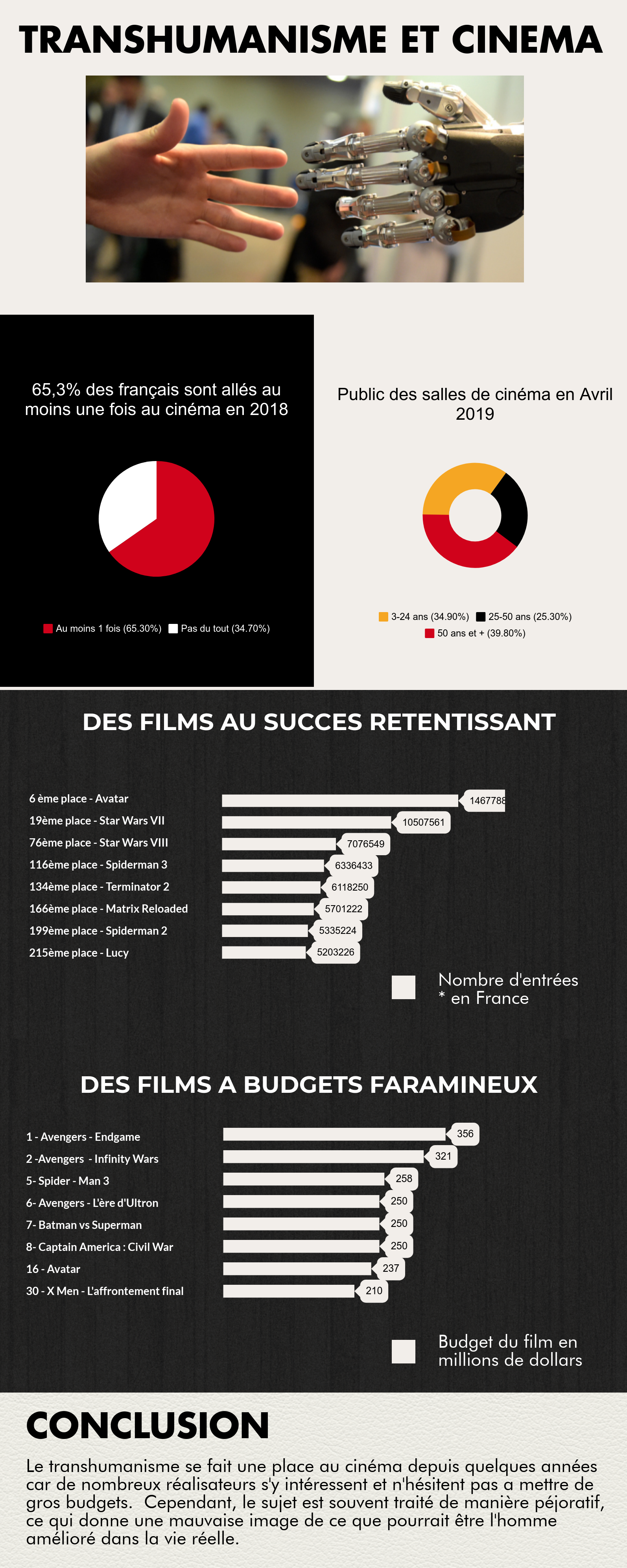 Depuis quelques années, la fascination pour cette idéologie grandit. Avant 1980, le transhumanisme demeure purement théorique. Au cinéma, on parle de « surhomme » qui aurait des capacités physiques développées mais pas d’humain augmenté. On retrouve cette vision dans les films Frankenstein et The Boogie Man Will Get You. C’est en 1980, avec l’avancée spectaculaire de la recherche que le transhumanisme va petit à petit se faire une place au cinéma. La représentation de l’homme amélioré évolue avec le développement de l’informatique, les travaux sur l’ADN, la robotique et les NBIC. Des films à la réalité il n’y a qu’un pas, on assiste ces dernières années à une « course » au transhumanisme, avec Google, IBM et de nombreuses start-up qui développent de nouvelles méthodes pour faire évoluer l’humain et le rendre toujours plus fort. Au cinéma, l’homme augmenté est souvent représenté par un super héros mécanisé. La grandeur, la prestance et la puissance de l’homme machine séduisent le spectateur. Tous ces ingrédients intriguent et fascinent, mais sont aussi source de questionnements existentiels…